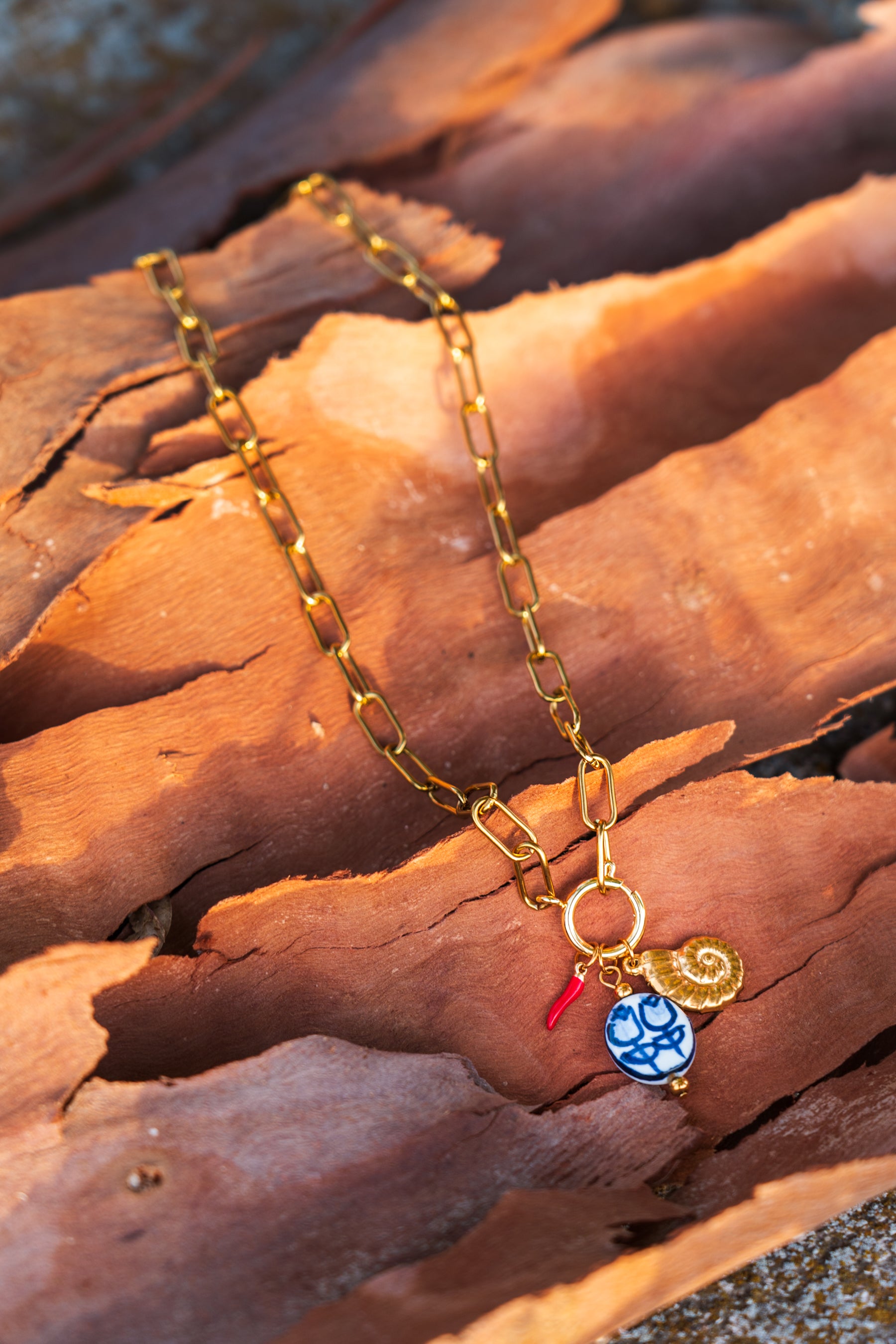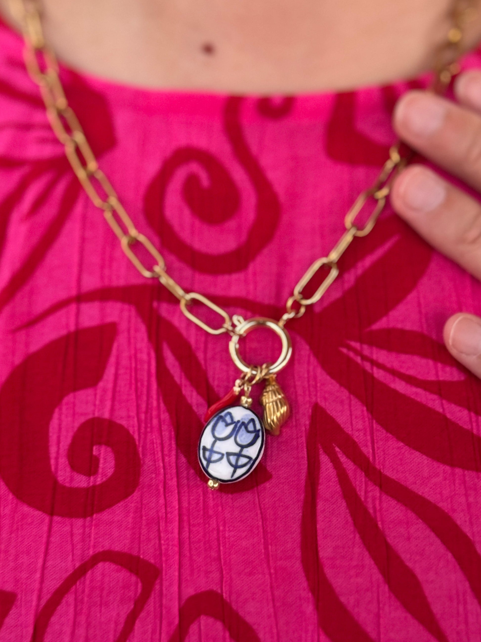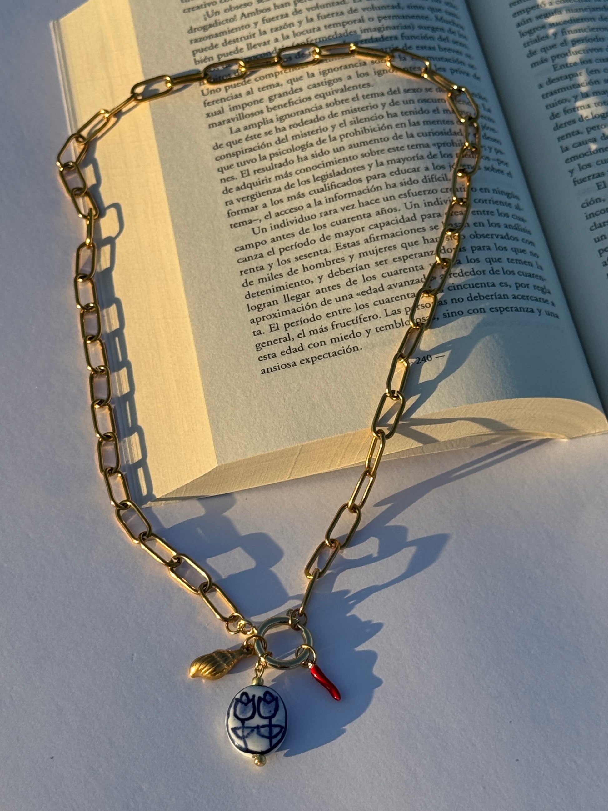 Una cadena dorada con fuerza y un colgante cerámico que parece rescatado de un viejo puerto andaluz.