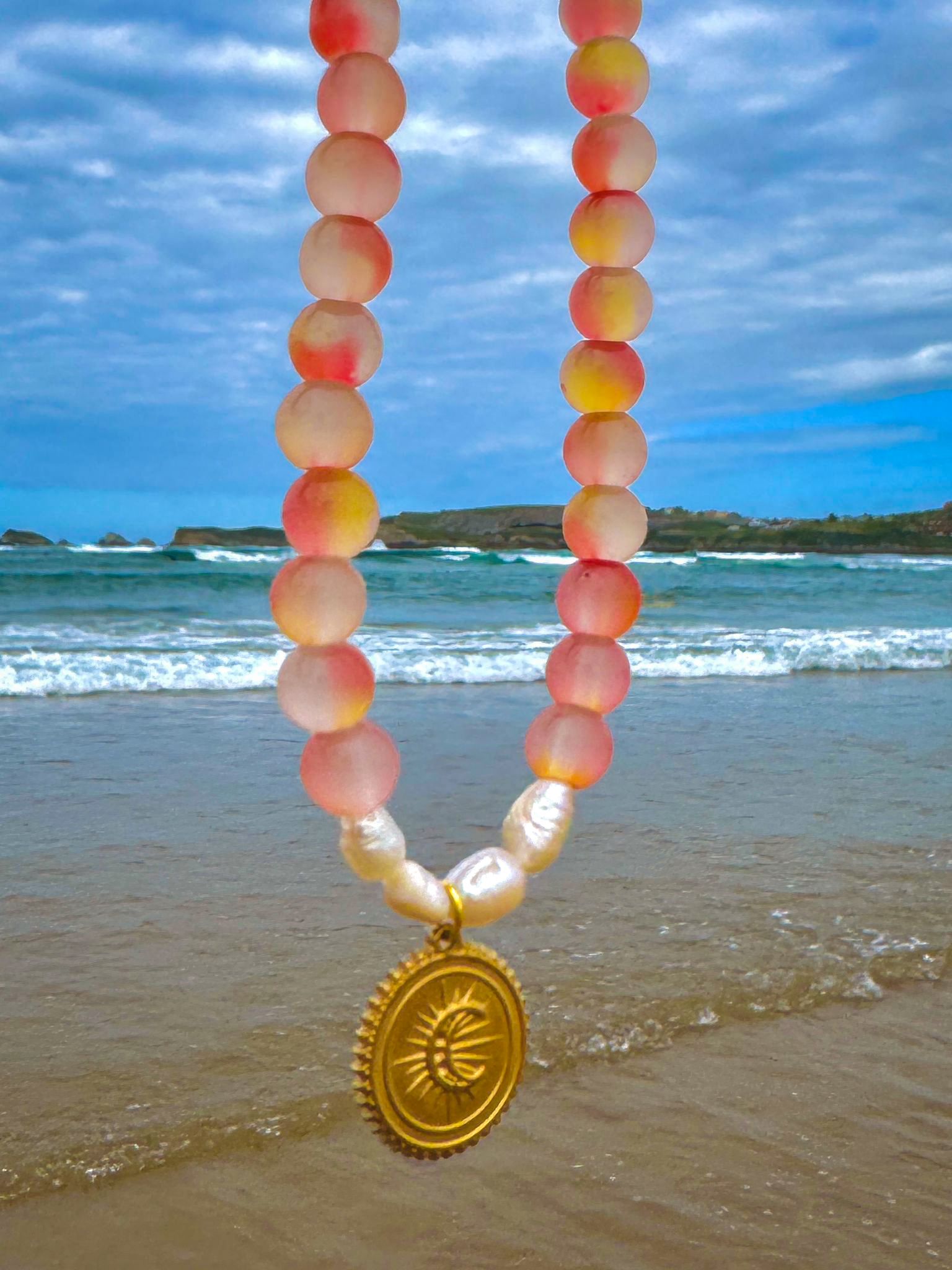 Un collar que combina perlas suaves con un medallón lunar dorado, ideal para almas soñadoras y elegantes ✨