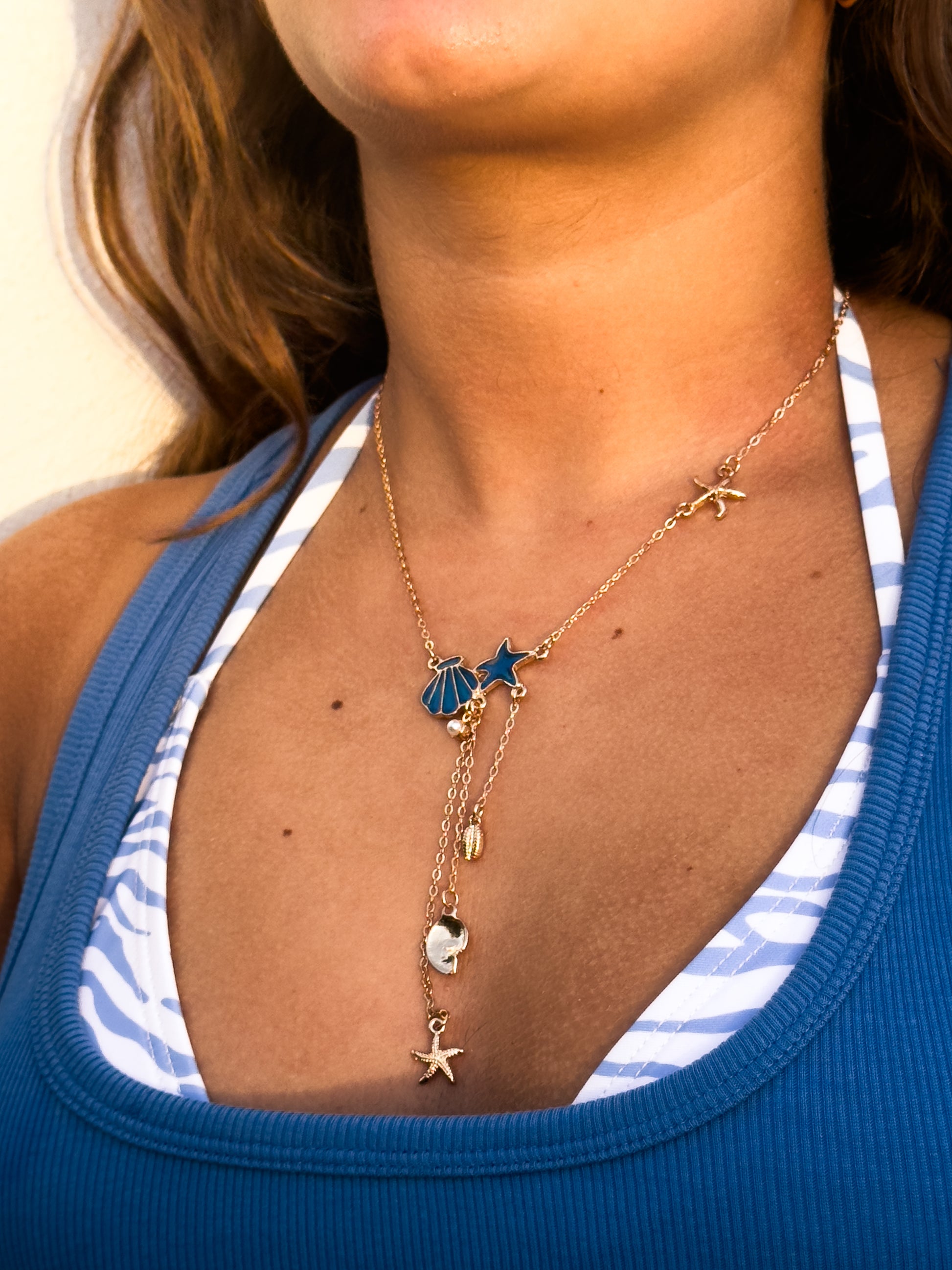 Inspirado en la frescura del mar, este diseño combina delicados charms marinos sobre una fina cadena dorada. Sus detalles esmaltados en tonos azules evocan la brisa, la arena y el sol, convirtiéndolo en el accesorio perfecto para llevar el espíritu del verano siempre contigo.