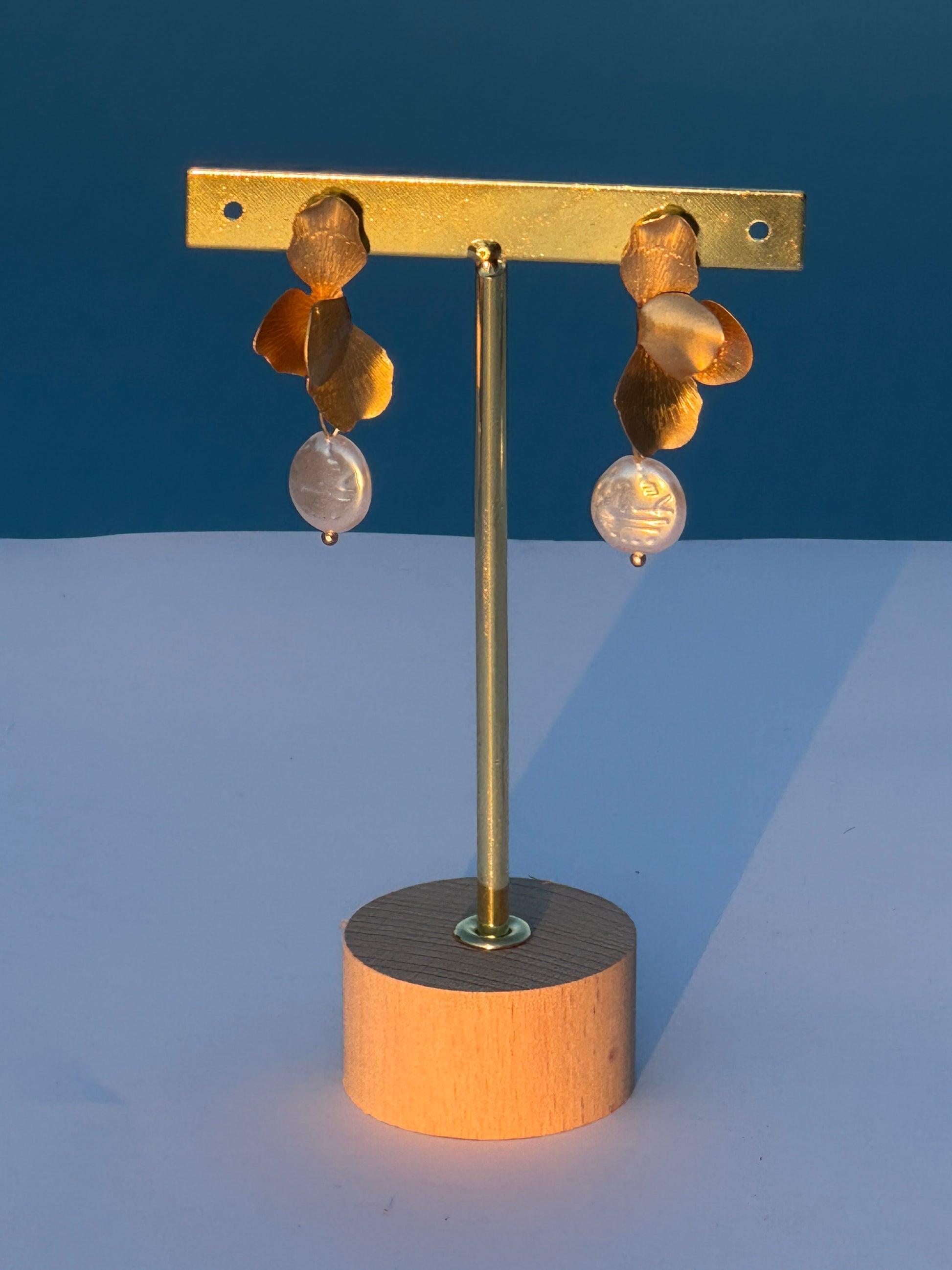 Pendientes dorados con formas irregulares y acabado en mate, rematados con una perla blanca que aporta un contraste limpio y elegante. Una pieza moderna, minimalista y fácil de combinar en cualquier ocasión.